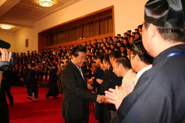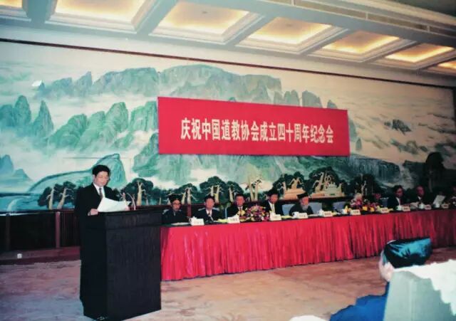 1997年11月7日,中国道协成立40周年纪念大会在人民大会堂隆重举行。全国政协副主席、中央统战部长王兆国,全国政协副主席赵朴初,中央统战部副部长李德洙,国务院宗教事务局局长叶小文等领导应邀出席会议。(图片由中国道教协会提供)