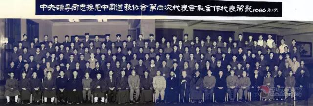 1986年9月8日至17日,中国道教协会第四届代表会议在北京白云观举行,应出席会议的97名代表,中共中央统战部及国务院宗教事务局于9月11日举行茶话会,招待全体代表,并宴请道协第四届常务理事。中央统战部武连元副部长在茶话会上作了重要讲话。9月17日,中共中央政治局委员习仲勋、全国政协副主席杨静仁、赵朴初,中央统战部部长阎明复、国务院副秘书长张文寿、国务院宗教局局长任务之等,在人民大会堂接见了全体代表,并合影留念。图为中国道教协会第四次代表会议合影(王伟业、秦京光藏,周金富提供)