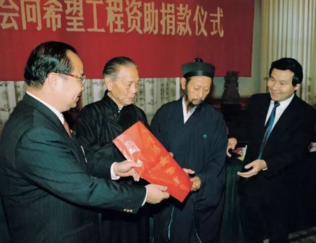 1993年9月17日至26日,由北京白云观、香港青松观、台北指南宫、美国、加拿大、澳大利亚青松观等著名宫观经团共同参加的“罗天大醮”在北京白云观举行,活动功德收入100万元全部用于资助希望工程。9月25日,捐赠仪式在人民大会堂举行,全国政协副主席孙孚凌等出席。(图片由中国道教协会提供)