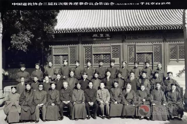 中国道教协会于一九八三年十月八日至十四日在北京白云观召开了第三届常务理事会第五次会议。会议的主要内容是学习、贯彻六届人大和六届政协会议精神,讨论道教知识专修班工作,介绍有关全国重点宫观的情况。会议由黎遇航会长主持,王伟业秘书长汇报协会一年来的工作,刘之维副秘书长汇报一年来北京白云观的宗教活动。图为中国道教协会三届五次常务理事会合影留念(王伟业、秦京光藏,周金富提供)